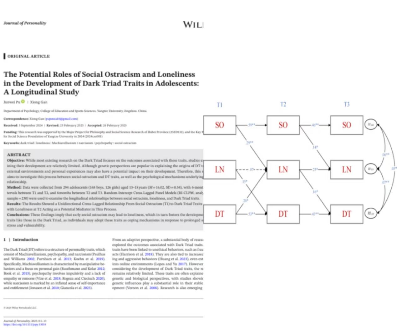 (通讯员 张绍杰)近日,我院硕士生蒲俊伟在APA主办的国际顶刊《Journal of Personality》(中国科学院SSCI/SCI分区心理学大类一区Top期刊,5年IF = 5.4)上发表题为“The Potential Roles of Social Ostracism and Loneliness in the Development of Dark Triad in Adolescents: ALongitudinal Study”的文章。蒲俊伟为论文第一作者,甘雄副教授为通讯作者。该研究是湖北省高等学校哲学社会科学研究重大项目(23ZD132)和长江大学2024年社会科学基金重点项目(2024csz001)资助的系列成果之一。