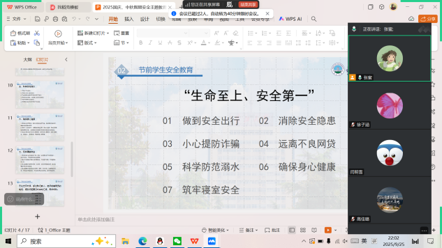 (通讯员:罗光彩)为切实做好国庆、中秋假期学生安全工作,增强学生安全意识,保障学生度过一个平安、愉快的假期,2025年9月25日晚19:00我院研究生分班组织开展了国庆、中秋假期安全教育线上主题会议。