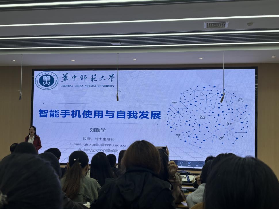 本次特别邀请了华中师范大学心理学院教授刘勤学博士担任主讲人,她为我院师生带来了一场题为《智能手机使用与自我发展》的精彩报告,讲座由院长助理严磊博士主持,心理系教师、心理学各领域研究生和本科生聆听了此次学术报告。