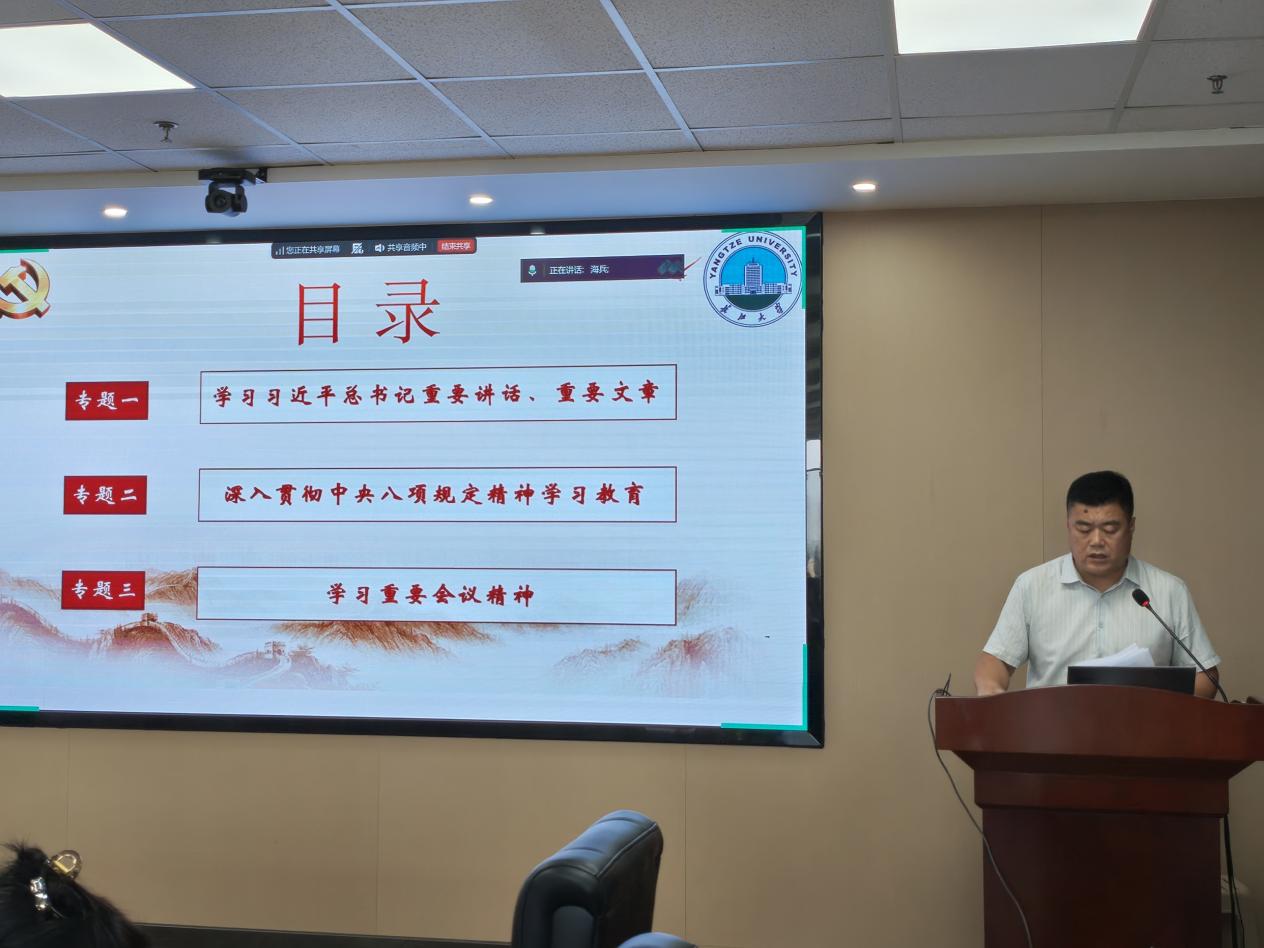 随后,学院党委书记于永伟带领全体教职工进行九月政治理论学习。学习内容包括习近平总书记在纪念中国人民抗日战争暨世界反法西斯战争胜利80周年大会上的重要讲话、《求是》杂志发表的习近平总书记重要文章《弘扬伟大抗战精神,向着中华民族伟大复兴的光辉彼岸奋勇前进》、习近平总书记关于作风建设的重要指示精神,以及中国共产党湖北省第十二届委员会第十次全体会议公报精神、学校新学期工作研讨会主要部署和违反中央八项规定精神典型案例警示等。