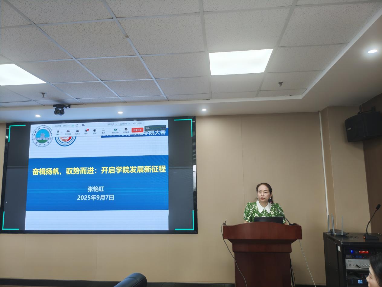 会议第四阶段,张艳红院长以《奋楫扬帆,驭势而进:开启学院发展新征程》为题作学院工作报告。报告首先系统传达了学校新学期工作部署会精神,强调全院要把思想和行动统一到学校党委和行政的决策部署上来,深刻把握“奋力冲刺双一流、推动事业高质量发展”的战略要求。学校指出,要以立德树人为根本,守牢安全与廉政红线;要以学科优化为抓手,推动有组织科研落地见效;要以师资队伍为支撑,全面增强育人合力;要以资源统筹为基础,不断提升办学效能;要以开放合作为路径,拓展校地校企新空间。这既是学校发展的总动员令,也是学院迈向新征程的行动指南。